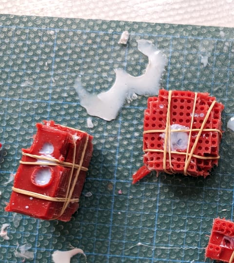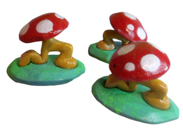 I created moulds for the mushrooms in three parts including the stem (legs?), cap and base which was created retrospectively. The moulds were fine, however I noticed warping of the mushroom cap when casting with polyeurethane, likely due to the use of rubber bands inconsistently tightened to hold the mould together, creating an uneven surface. I did a fair bit of sanding on each piece to round it out.