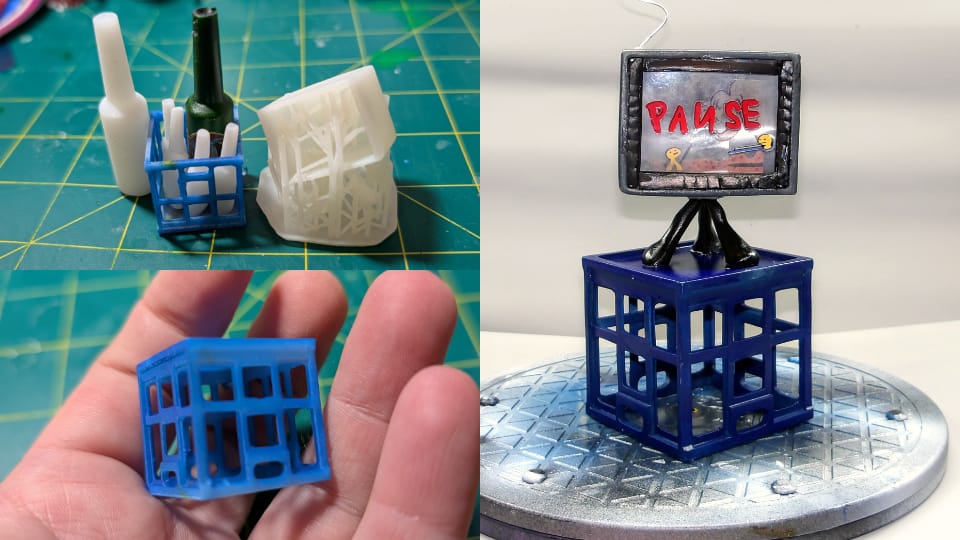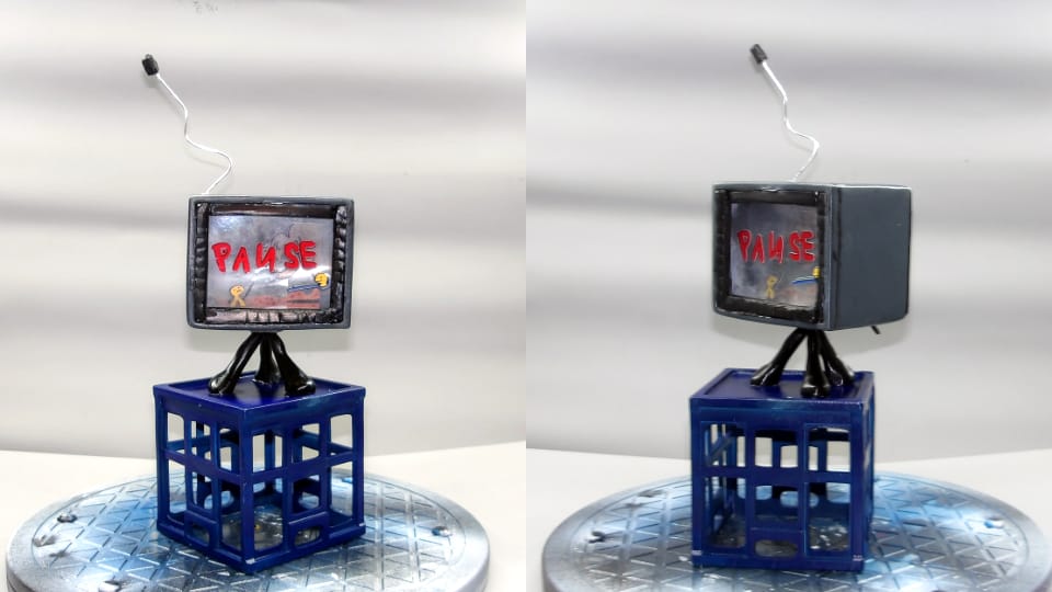 The TV screen was less of a success. Despite the geometry of the model itself breaking in several areas and structural fragility where the legs converge, the biggest challenge was the TV screen. I was a little too ambitious with the graphics and didn't factor it in to the modelling stage. I wanted to create a paralleling effect using multiple layers to represent a graphic element, including a background, foreground, character 'sprites' and HUD. The stickers printed out great, but the clear material chosen for each layer was too opaque and aligning it in the rigid TV model was unforgiving.