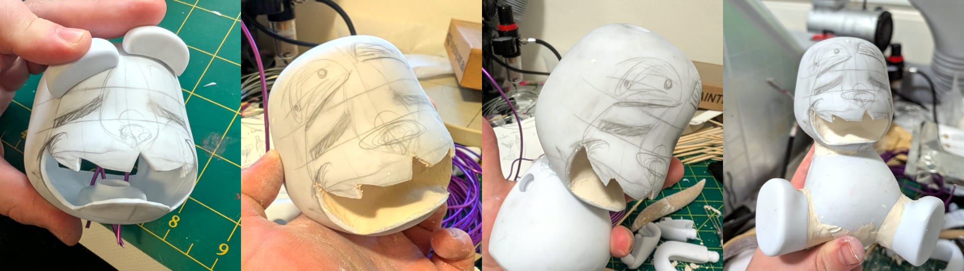With rough sketches outlined, I enjoyed creating the details. Cutting through the vinyl was a bit nerve wracking, but fortunately it worked out well. At the time I wasn't sure what would make a good filler material and ended up with airdry clay. This wasn't ideal as my lack of experience with the clay resulted in cracking and unintentional textures that couldn't be sanded completely.
