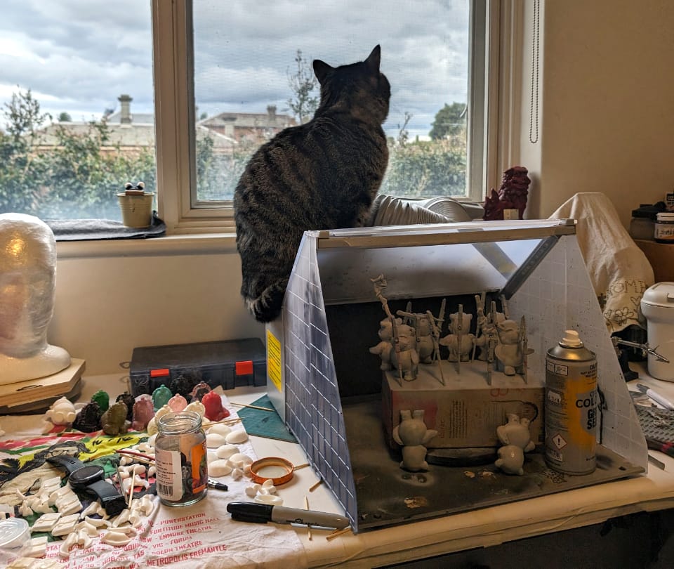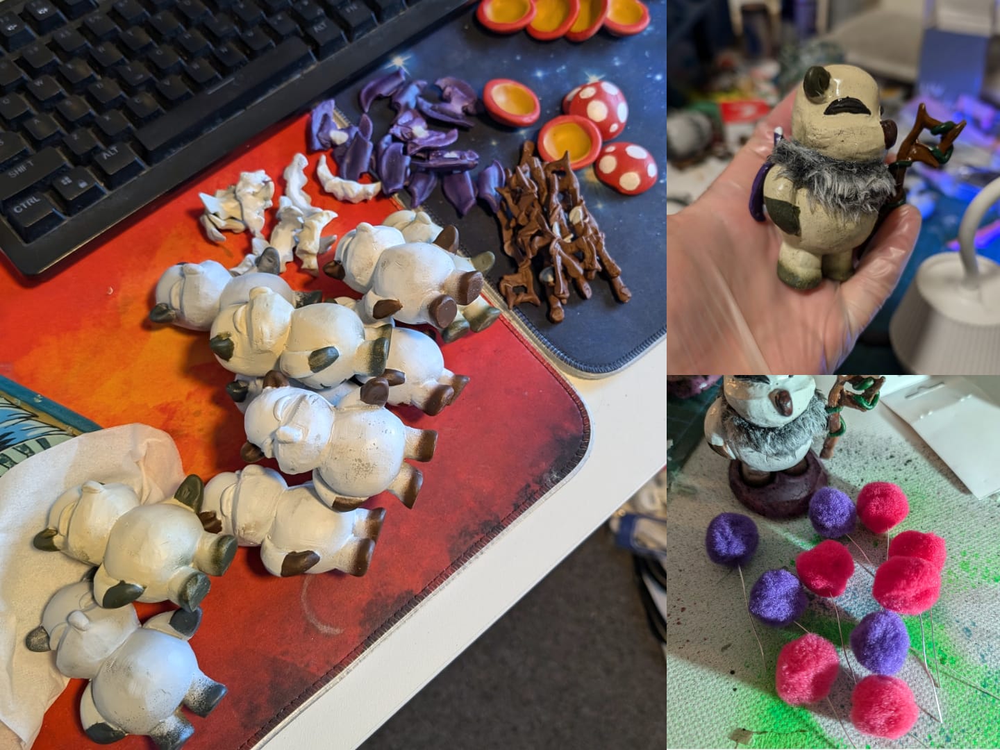 Progress shots of the Woodland Friendos, Mushrooms and Sphynxdawgs.
